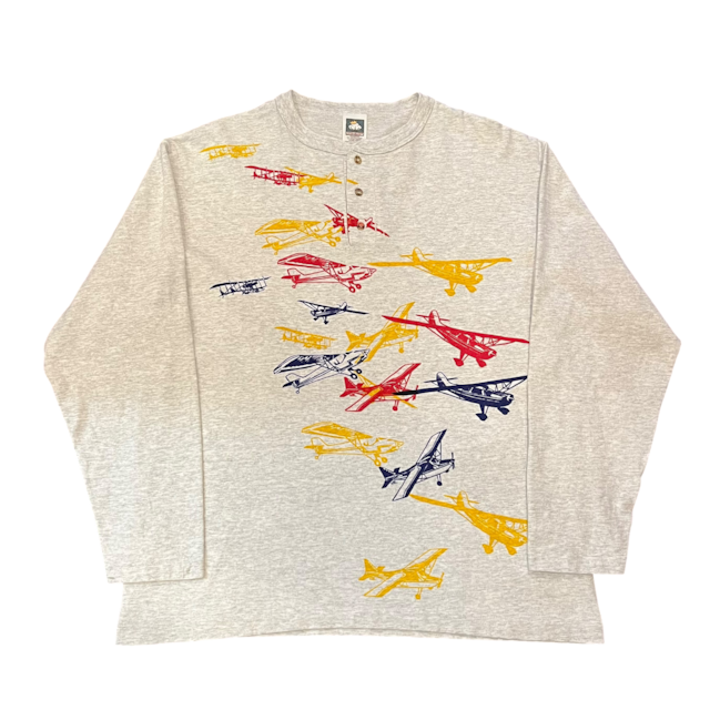SIZE:L 肩幅53.5 身幅56 着丈68 COTTON DELUXEのヘンリーネックロンT。 ヘンリーネックのボディとしては有名かと思います。 両面にテストプリントのような感じで飛行機のプリント。 1枚で着た時にもしっかり存在感はあります。 春先活躍する1枚かと。 若干の使用感と袖口に薄い汚れがございます。