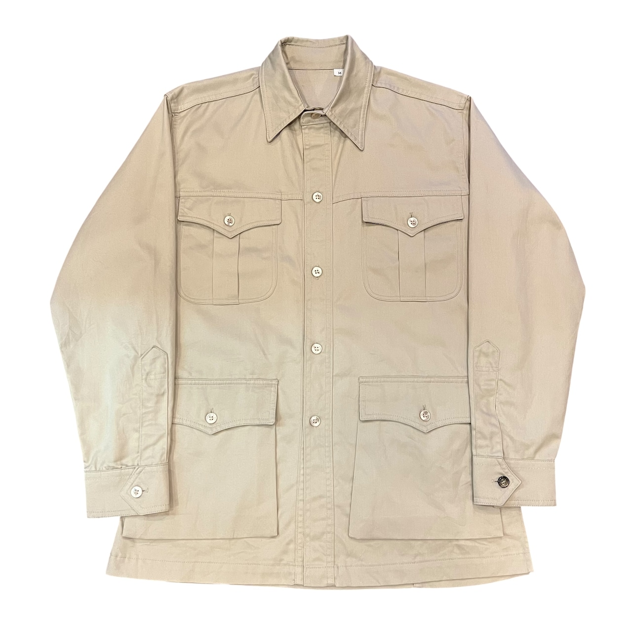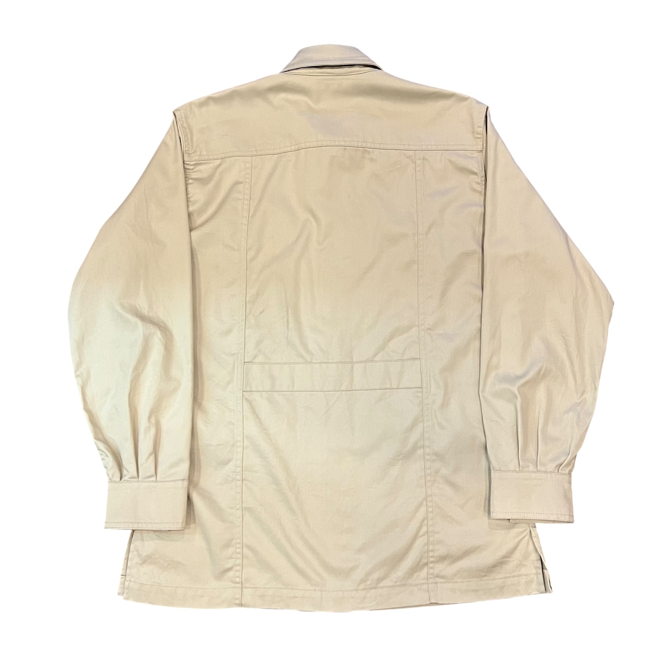 通常のサファリジャケットはエポレット付きでウエストにベルトがある物が多い印象ですがフロントのポケットのみで着やすいシルエットかと思います。