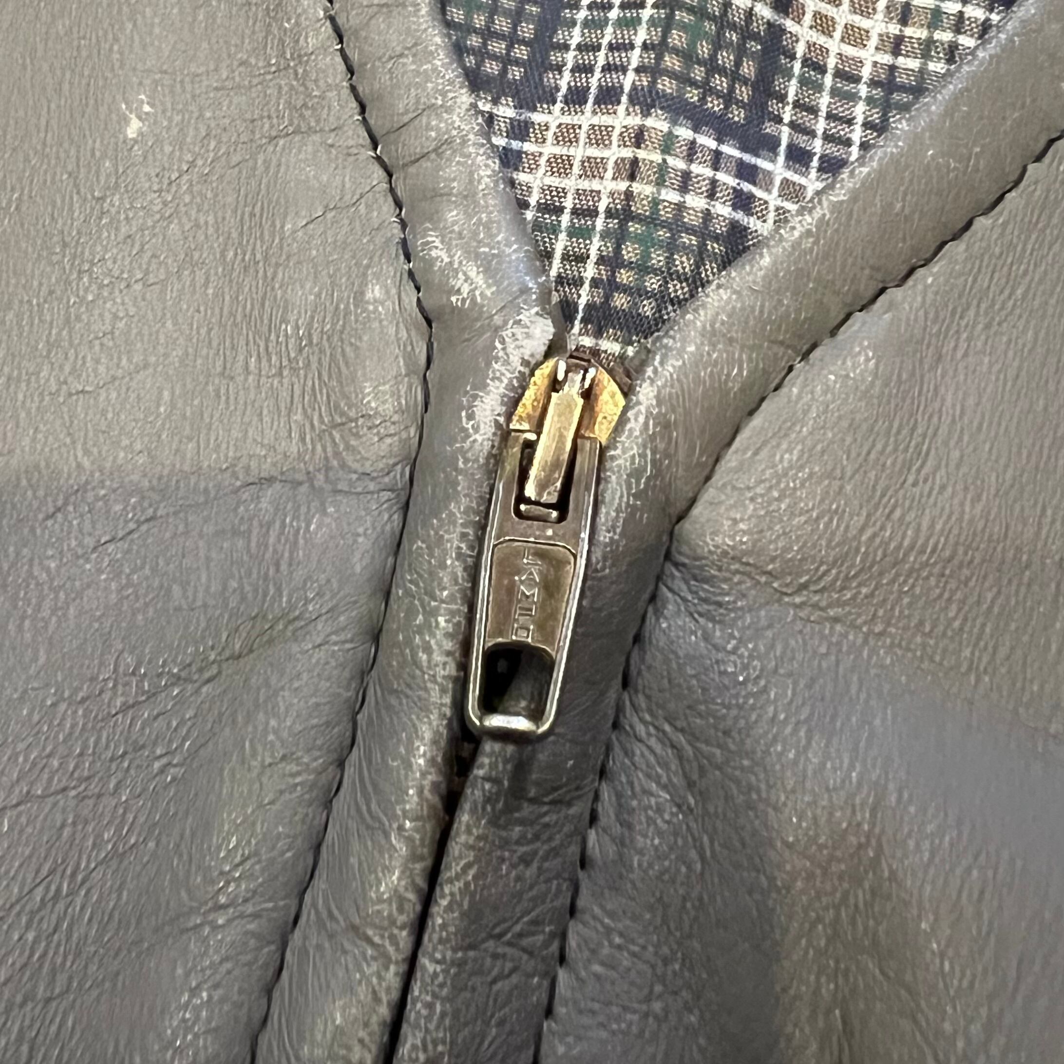 グレーのレザーにサイドとポケット口は黒のレザー、裏地はチェックと洒落たディテール。